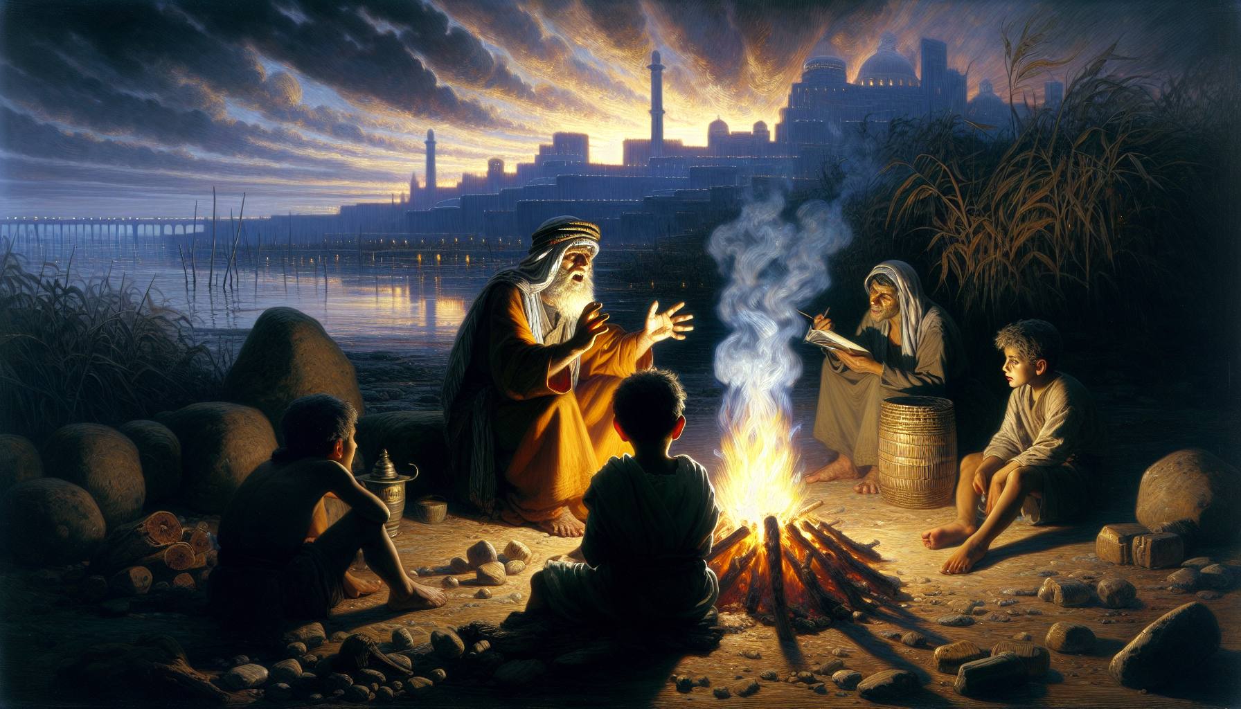 A fogueira crepitava baixo, reduzida a brasas alaranjadas que pintavam de sombras dançantes os rostos cansados ao seu redor. O acampamento em Gilgal repousava sob um manto de silêncio pesado, o tipo de quietude que só vem depois de muita…
