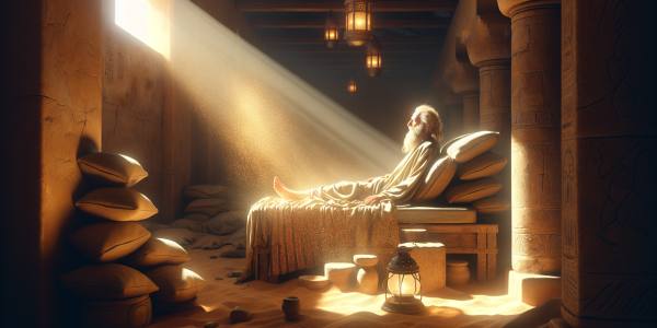 O ar no aposento era denso, quente, carregado com o cheiro de ervas secas e óleo de oliva. Uma lamparina de barro combatia fracamente a penumbra, lançando sombras dançantes nas paredes de pedra áspera. Jacó repousava sobre uma esteira grossa,…