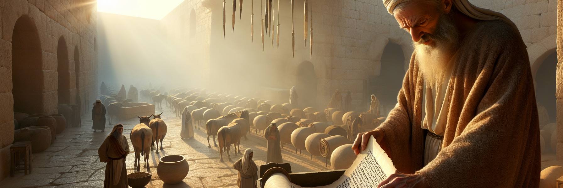 O texto pedia uma história baseada em 1 Reis 4. Aquele capítulo seco, quase administrativo. Listas. Nomes de oficiais, de províncias, de provisões. Mas por trás de cada nome, havia uma história. Azarias, filho de Zadoque, o sacerdote. Sim, aquele homem de fala mansa e olhos que pareciam ver além do sacrifício de animais, para o coração do próprio sacrificante. Ele e os dois escribas, Eliorefe e Aías, filhos de Sisa. Homens cujas mãos cramavam, cujas costas doíam ao final do dia, transformando decretos reais em registros permanentes. Salomão os imaginava, à luz bruxuleante das lamparinas de azeite, conferindo os rolamentos das caravanas que chegavam de Arã, carregadas de lingotes de prata e cavalos selecionados.
