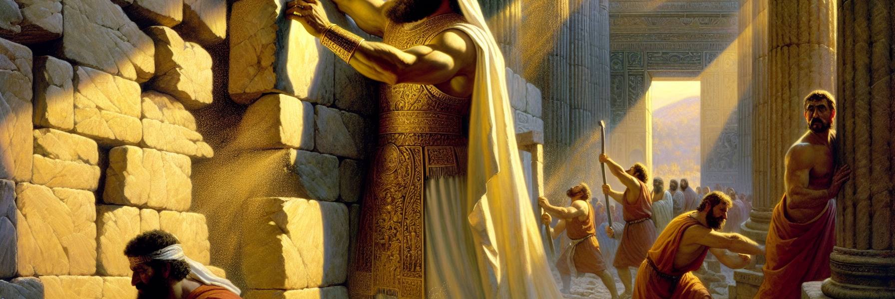 Havia sete anos desde aquele dia sufocante em que os gritos tinham cessado nos aposentos internos do palácio, e o sumo sacerdote Joiada, com suas mãos nervosas e firmes, o colocara sobre o trono. Sete anos sob a asa daquele homem velho, cuja barba branca parecia feita da mesma luz que filtrou pelos querubins do Santo dos Santos. Joiada era seu eixo, sua lei e sua voz. Mas agora, ao olhar para aquela estrutura outrora gloriosa, Joás sentiu pela primeira vez uma vontade que era só sua, um fervor que não vinha do sacerdote, mas de uma memória mais profunda: a memória do tio, do rei Davi, cujos salmos ele murmurava à noite.