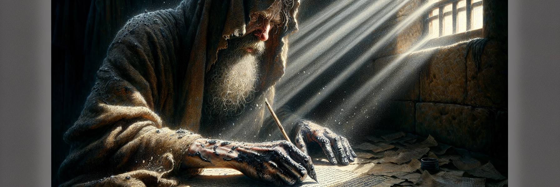 Ele estava só. A solidão era sua companheira mais fiel há anos. Rolou o pequeno rolo de couro sobre a mesa áspera, suas mãos calejadas tremendo não de idade, mas da carga tremenda que sempre precedia o ato. A mensagem vinha como uma tempestade dentro de seu peito, uma agonia divina que precisava ser despejada em palavras ou ele arrebentaria. Não era sua voz que buscava, era *Voz*. Um silêncio que rugia.