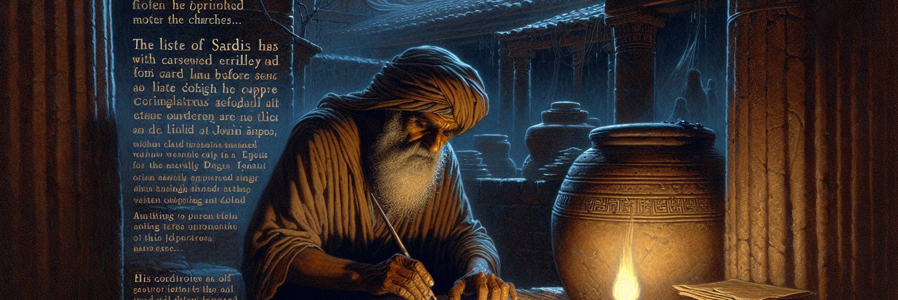 Sardes. Um nome que soava a pó. “*Tens nome de que vives, e estás morto*.” A frase caiu como uma lápide. Fui buscar palavras para descrever a morte espiritual, aquela que veste roupas de vitalidade, que repete fórmulas, que mantém a reputação intacta enquanto o interior apodrece. “*Sê vigilante*”, “*consolida o resto*”. Era um despertar para um cadáver. Poucos, tão poucos, que não contaminaram suas vestes. Andarão de branco. O nome não será riscado. Escrevi com uma ponta de desespero, como se tentasse acordar a mim mesmo.