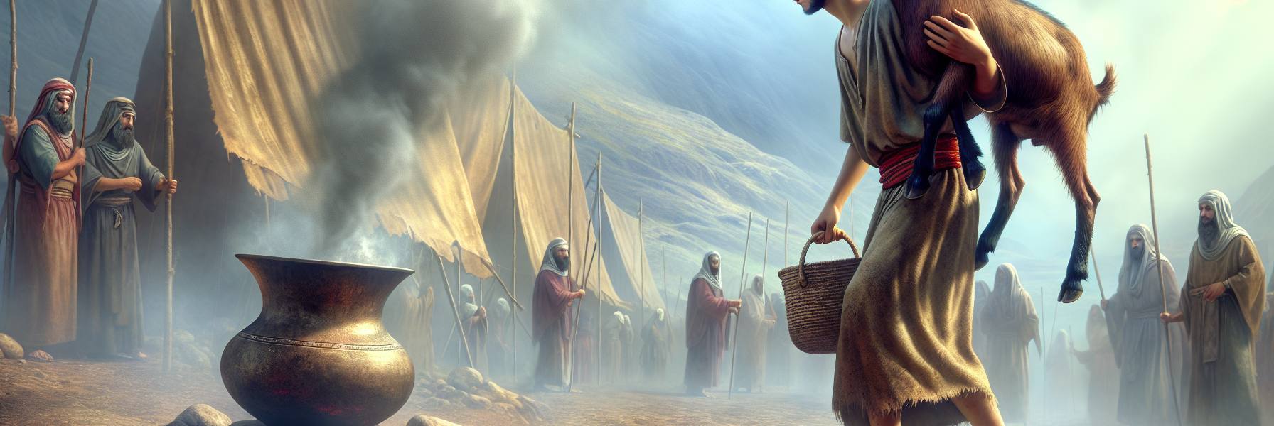Do lado de fora do pátio, próximo à entrada de linho retorcido, um homem esperava. Eliabe, da tribo de Judá. Seus olhos, vistos de longe, pareciam carregar uma sombra, não de angústia, mas de uma urgência solene. Nas mãos, ele conduzia com cuidado um animal: um cordeiro macho, sem defeito algum. A lã branca como a neve do Sinai contrastava com a terra marrom. O animal caminhava tranquilo, ignorante de seu destino, seu focinho úmido farejando o ar carregado.