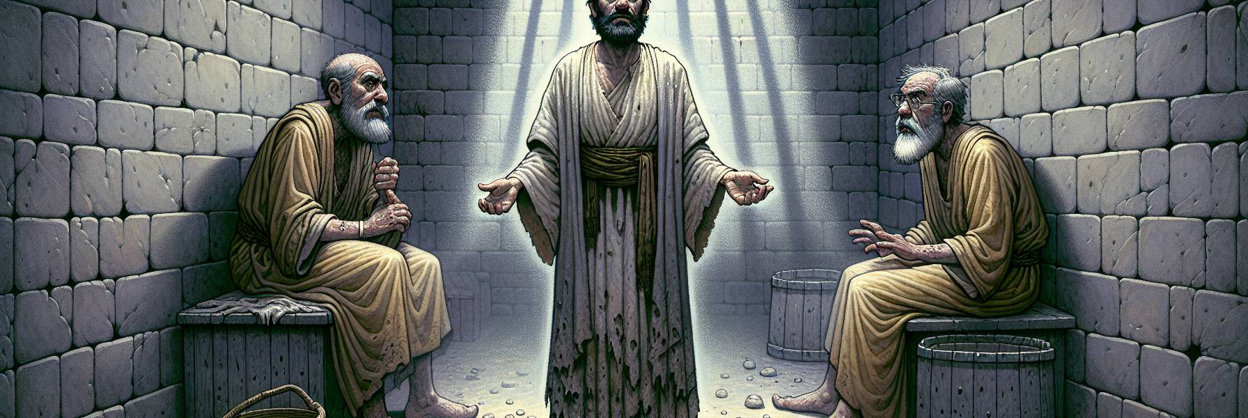 O silêncio que caiu foi absoluto, mais pesado que qualquer corrente. O rosto do padeiro desmontou-se, a cor fugiu-lhe por completo. O copeiro olhou para o companheiro, e depois para José, e uma barreira invisível ergueu-se entre os dois. A promessa de vida para um era a sentença de morte para o outro. José nada mais acrescentou. A verdade, uma vez declarada, era uma pedra lançada. Cabia a cada um carregar o seu peso.