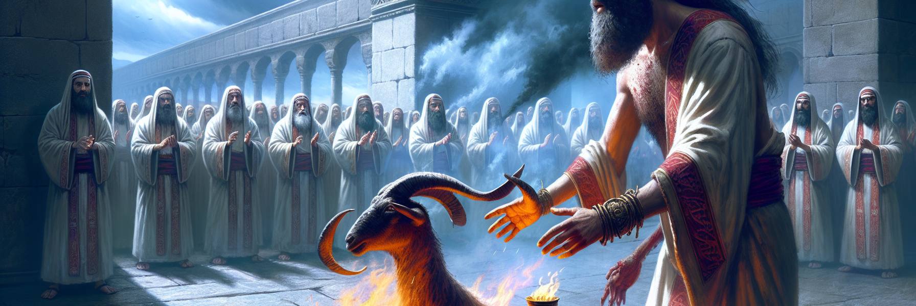 O sol da tarde batia na pedra clara do pátio do templo, mas o calor que subia não era apenas do dia. Era um calor pesado, de multidão, de animais inquietos, de brasas que não se apagavam. O ar cheirava a incenso doce, sim, mas por baixo dele vinha o fedor acre do sangue seco nos cantos, da urina dos cordeiros, da ansiedade humana. Azarias, um levita de rosto marcado pela rotina, observava de longe o vai e vem. As filas eram longas. Homens de roupas finas, mulheres com véus bordados, camponeses com as túnicas empoeiradas – todos traziam algo. Um cordeiro branco, uma cesta de grãos, uma vasilha com azeite. As mãos estendiam as ofertas, os sacerdotes as recebiam com gestos rápidos, quase mecânicos. O altar de bronze cuspia fumaça continuamente, uma coluna cinzenta que subia reta para um céu de um azul impiedoso. Era um espetáculo de devoção. E, no peito de Azarias, uma náusea quieta se instalava.