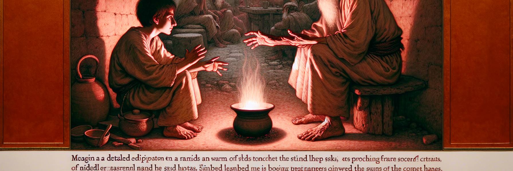 Naquela noite, sentado à porta de sua casa de pedra, Eliab falou a Joás. Não com a voz áspera do juízo, mas com o tom baixo e cantante das histórias antigas. “Ouça, meu filho. O SENHOR fará novos céus e nova terra. E a história de agora, esta de fome e vergonha, será esquecida, apagada da memória.” O menino encostou a cabeça em seu joelho, os olhos arregalados refletindo a chama do pavio.