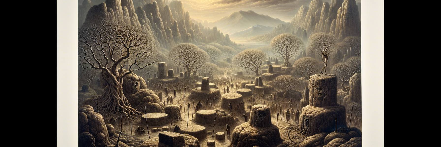 Os vales, outrora cheios do murmúrio de ribeiros e do canto dos adoradores, ficaram entupidos de ossos. As colinas, antes recortadas contra o céu, agora pareciam bordadas de uma renda pálida e sinistra. E sobre tudo, um silêncio pesado desceu. Não o silêncio da paz, mas o da completa esterilização. “Farei a terra assolada e deserta”, e assim era. O grito das festas pagãs, o choro das vítimas sacrificais, o estalar do fogo nos altares… tudo se calou. Só restava o sibilar do vento cortando as fendas das rochas, passando pelos crânios vazios com um som flautado e fantasmal.