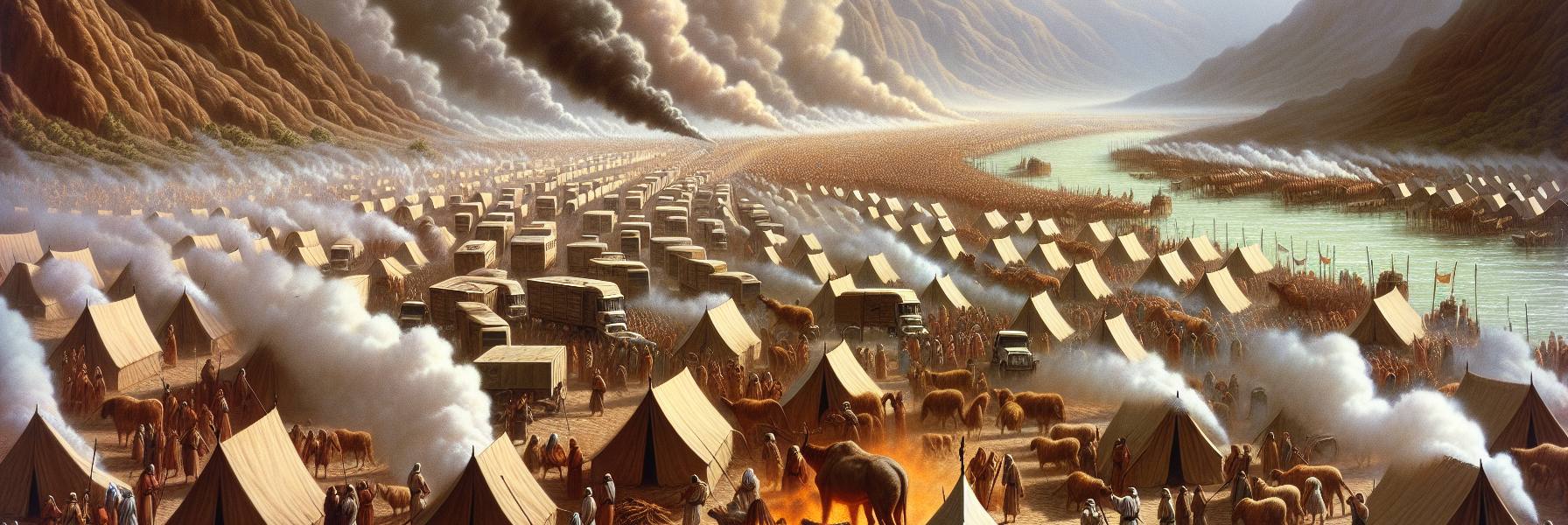 O sol da manhã ainda não havia dissipado completamente o frio úmido que subia das margens do Jordão. Uma névoa baixa, teimosa, enrolava-se nos carvalhos e tamargueiras, como se relutasse em revelar o rio que rugia à frente do acampamento. O povo estava em movimento há dias, uma massa compacta de poeira, esperança e cansaço. Agora, parados, o murmúrio era diferente. Não era o falatório do caminho, mas um sussurro denso, carregado de um temor solene. Todos olhavam para aquela faixa de água barrenta e violenta, a última fronteira.