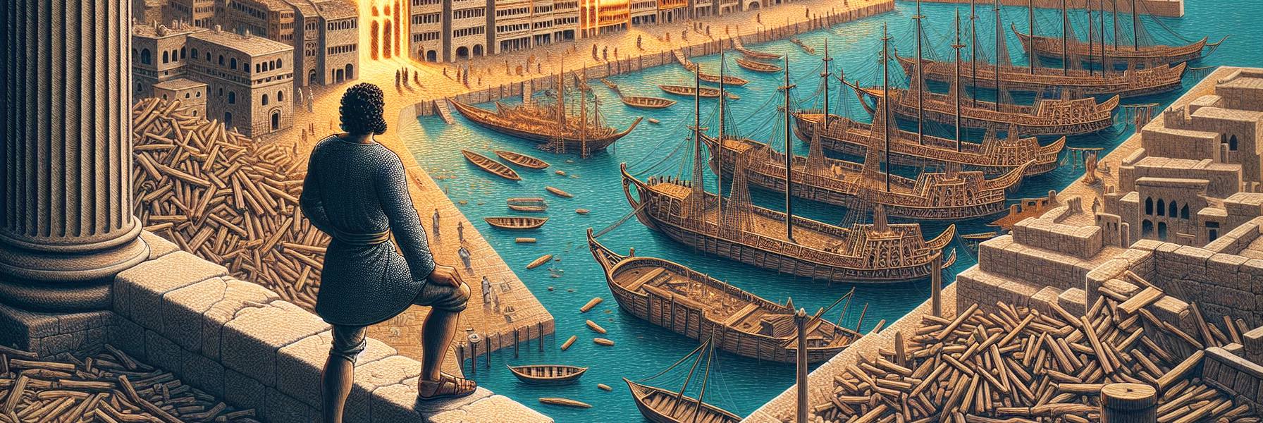 Não de navios quaisquer, mas daquela grande frota de Tarshish, os orgulhosos vasos de guerra e comércio que partiam para o fim do mundo conhecido e voltavam carregados de prata, ferro, estanho e chumbo. A baía, outrora um bosque flutuante de mastros, parecia vasta e desolada. O silêncio foi a primeira praga. Um silêncio pesado, quebrado apenas pelo lamento das gaivotas e pelo eco oco das ondas batendo contra os cais vazios.