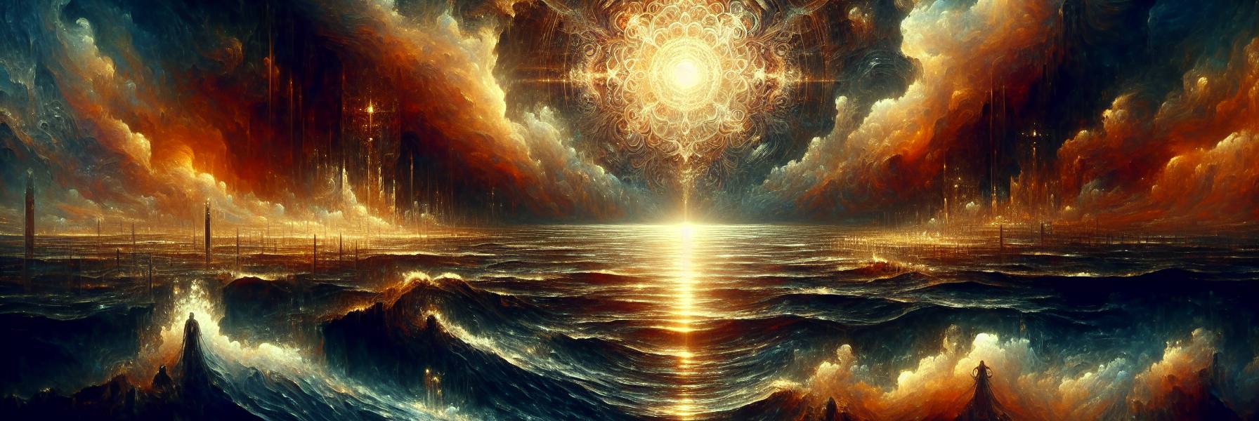 Então, veio a luz. Não uma luz que ilumina, mas uma que revela. Era como se o véu de todas as coisas se dissolvesse, e a estrutura oculta da criação ficasse à mostra. Foi quando vi o mar. Mas que mar era aquele? Não era de água, não tinha maré, nem espuma, nem cheiro de sal e alga. Era um mar de vidro, sim, mas vidro vivo, translúcido e profundo como um céu invertido. Misturado a ele, faíscas de fogo dançavam lentamente, como brasas presas em âmbar. Não dava para dizer onde terminava o chão e começava aquele abismo cristalino. E sobre ele, em pé, os que tinham vencido. Não havia muitos. Suas formas eram nítidas e ao mesmo tempo difíceis de fixar. Não ostentavam armaduras brilhantes ou auréolas convencionais. Tinham a marca da fidelidade no olhar, uma quietude que era poder. Seguravamos harpas, instrumentos estranhos, que pareciam feitos da mesma substância do mar debaixo de seus pés. Estavam parados, mas uma música silenciosa, uma expectativa de cântico, pairava sobre eles como um aroma.